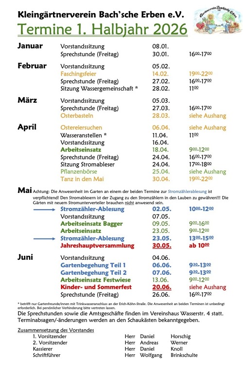 Hier finden Sie unsere Termine für das 1. Halbjahr 2026. Wir freuen uns auf eine rege Teilnahme. Bei Fragen wenden Sie sich bitte an den Vorstand.